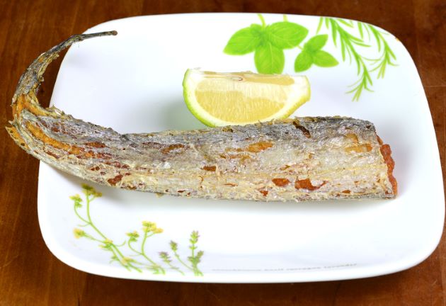 タチウオの素揚げ 尾の部分は素揚げがいちばん簡単だと思っている。身の薄いところを切り落とし、水分をよくきる。これを低温で時間をかけてじっくりと揚げる。前方に行くほど中骨は硬くなるが尾に近い部分はまるごとさくさく食べられる。