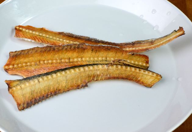 タチウオの骨せんべい 比較的小振りのタチウオの中骨はとても柔らかい。骨せんべいにするとさくさくとしておいしい。中骨は水分をよくきる。片栗粉をまぶしてじっくり二度揚げにする。