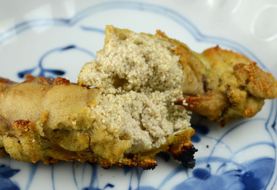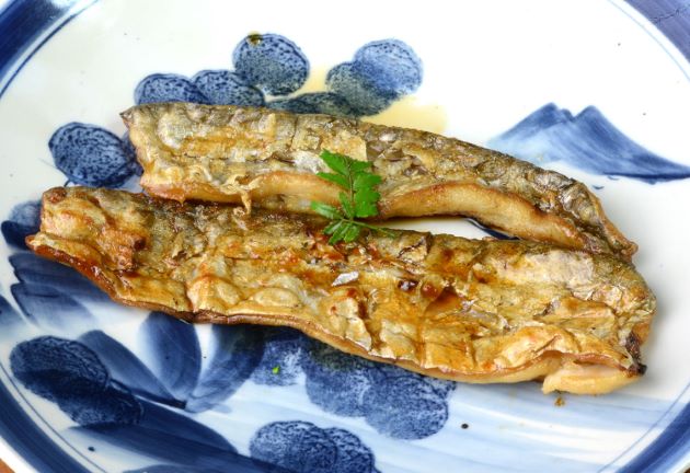 タチウオ真子の塩焼き 真子をていねいに取りだし、表面の汚れや内臓などを取り除く。振り塩をして1日程度寝かせてじっくり焼き上げる。口に入れるとほくほくと甘く、ほどよい渋味とうま味が感じられて非常に美味。ご飯にとても合う。