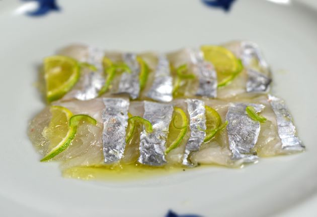 タチウオのカルパッチョ 水洗いして三枚に下ろす。できるだけ薄く切り、ニンニク・オリーブオイルを敷いた上にすだち(柑橘類)と虎の尾(三重県尾鷲市の唐辛子)をはさみ並べて行く。上から減塩を振り、オリーブオイルを再度かける。少し馴染ませて食べるといい。