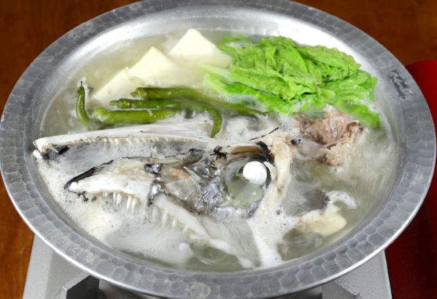タチウオの酒塩鍋(ちり、水炊き) あらを使ってもいいし、切身を使ってもいい。湯通しして氷水に落として粗熱とぬめりを流す。昆布だしに酒・塩の味つけの汁の中で煮ながら食べる。夏は青い唐辛子(ここでは三重県尾鷲の虎の尾)などを一緒に煮て、食べるとき皿に取り、辛味をつぶしながら加減して食べるとうまい。