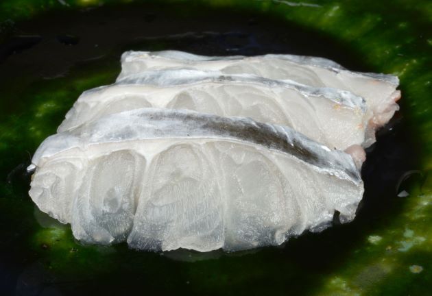 タチウオの刺身せごし 田辺市など和歌山県南部。三枚に下ろして端から切り離したもの。ポン酢などで食べる。