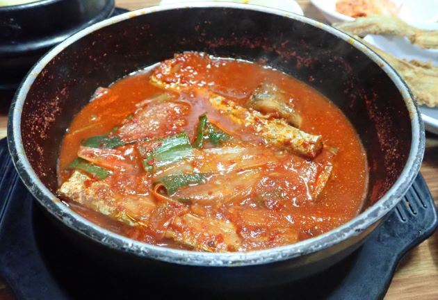 갈치조림(カルチ ジョリムorカルチ チョリム タチウオの煮つけ) 済州島(제주도/チェジュド)の名物料理。タチウオを煮汁(にんにく・しょうが・唐辛子・しょうゆ・酒・水・砂糖・だし)で煮たもの。かなりの辛さだが、煮汁のうまさとタチウオのたんぱくな味わいが相まってとてもうまい。ご飯に合う。ソウル南大門市場周辺では名物となっている。