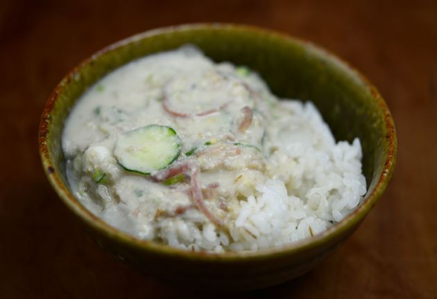 タチウオの冷や汁 タチウオ、トビウオなど焼いておいしい魚を使う。焼いてほぐしておく、ゴマと麦みそをすり鉢ですり、焼いた魚を加えてする。少しずつ水を加えて、キュウリ、夏の香辛野菜であるネギ、みょうが、青じそなどを混ぜる。麦みそが非常に合う。これをご飯にかけて食べるのだが、箸が止まらなくなる。協力/佐藤厚さん(長崎県雲仙市)