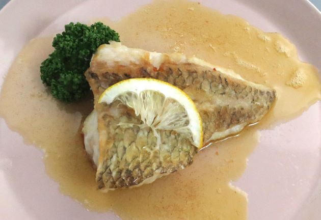 コケノコギリのソテー 水洗いして三枚に下ろし、切り身にする。塩コショウして少し寝かせ、出て来た水分を拭き取り、ニンニク風味をつけた多めの油で皮目からじっくり弱火でソテーする。皮側が香ばしく上がったら返し、火を強くして油を皮にかけながら仕上げる。切り身を取り出し残ったフライパンにシェリー酒を加えてデグラッセ、ソースに。
