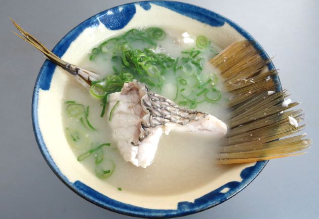 コケノコギリのみそ汁 あらを集めて置く。食べやすい大きさに切り、湯通しする。冷水に落として残った鱗やぬめりを流す。水分をよくきり、水から煮出してみそを溶く。だしがたっぷり出て、非常に味わい深い汁になる。ご飯に合う。