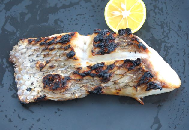コケノコギリの塩焼き 水洗いして切り身にして振り塩をする。1時間以上置き、じっくりと焼き上げる。表面から脂がにじみ出ていい香りが立つ。上品な白身で嫌みがない。