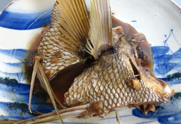 コケノコギリの煮つけ 非常に大型であるのでかまだけを煮つけてみた。水洗いしてかまを切り取り、湯通しする。冷水に落として残った鱗とぬめりを流して水分をよくきる。酒・砂糖・醤油でこってりと甘辛く煮る。味つけはお好みで。皮目の味わいが深く、身離れのいい白身がまた美味である。