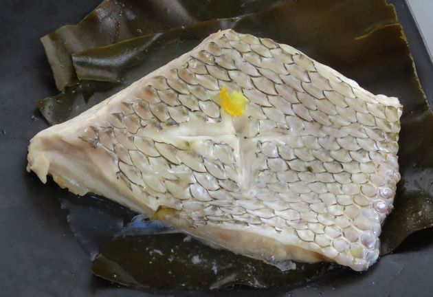 コケノコギリの酒蒸 水洗いして三枚に下ろし、切り身にする。振り塩をして少し置き、表面に出て来た水分をよく拭き取る。これを戻した昆布の上にのせて酒を振り、10分ほど蒸す。蒸気を受けて身がふっくらとふくらみ、非常に柔らかい。皮と身に味がある。