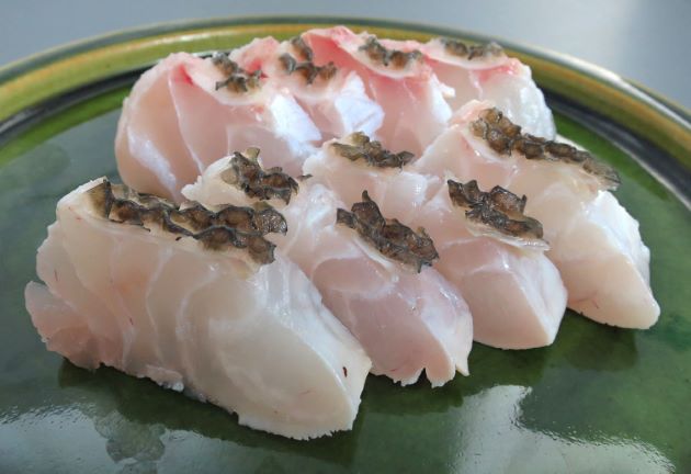 水洗いして三枚に下ろす。腹骨と血合い骨を取り、水分をよく拭き取る。皮目に湯をかけて氷水に落として粗熱を取る。水分をよくきり、刺身状に切る。淡泊な中にほんのり甘味、うま味がある身、皮の食感と皮直下の味わいがあいまってとても味わい深い。