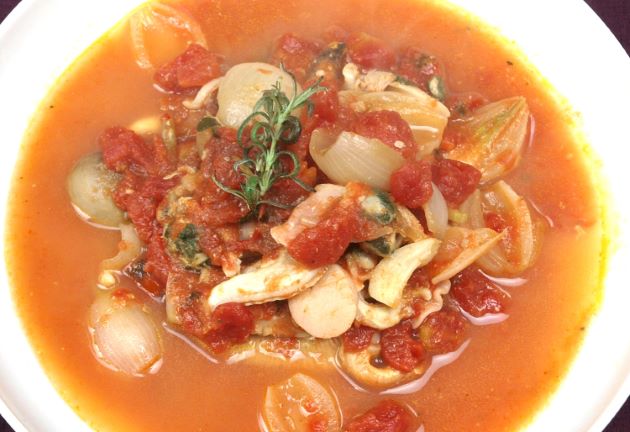 ウチムラサキのトマトスープ 剥き身にして塩水などで軽く洗い、適宜に切る。フライパンにオリーブオイル、にんにくを入れて火をつける。玉ねぎみじん切りとトマトの乱切りを炒めて水分が出て来たらローリエの葉と、ウチムラサキを加えて火を通す。仕上げに白ワインを加えて、塩コショウで味つけ、少し煮て火を止めて出来上がり。