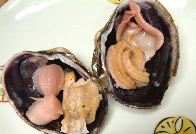 ウチムラサキの湯引き 剥き身にして塩水などで軽く洗い、内臓を取り、足は開いて、ヒモと貝柱とともに水分をよく切って置く。湯にくぐらせて氷水などに落とす。あら熱がとれたら水分をよく切り、貝殻などを器にして盛る。微かに渋みがあるが、まずくはない。