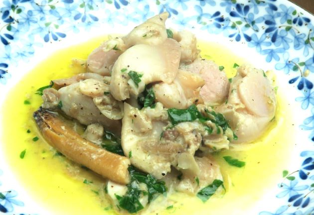 剥き身にしてざっと洗い、水管や足などを食べやすい大きさに切る。水分をよくきり熱したバター、にんにくにからめながらソテーする。