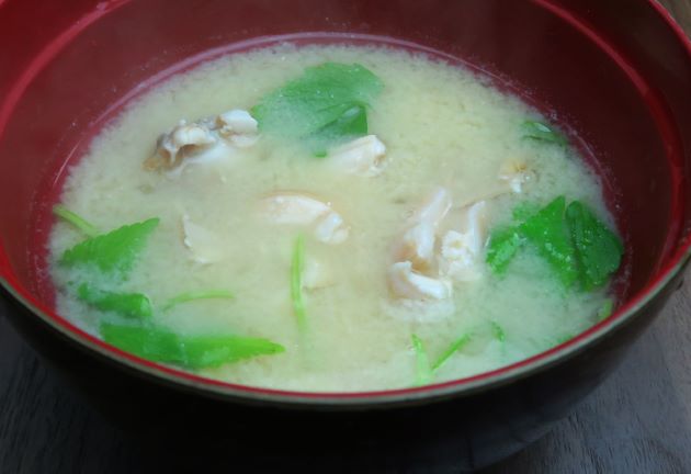 ウチムラサキのみそ汁 貝殻が大きいので、必ず剥き、塩水などで軽く洗って適宜に切る。これを水から煮出してみそを溶く。みそを溶いたらすぐに火を消して熱を通しすぎない。また沸騰したらみそを溶き、切ったウチムラサキの身を加えてすぐに火を消してもいい。だしを楽しむか、身を味わうかでやり方を変えるとよい。
