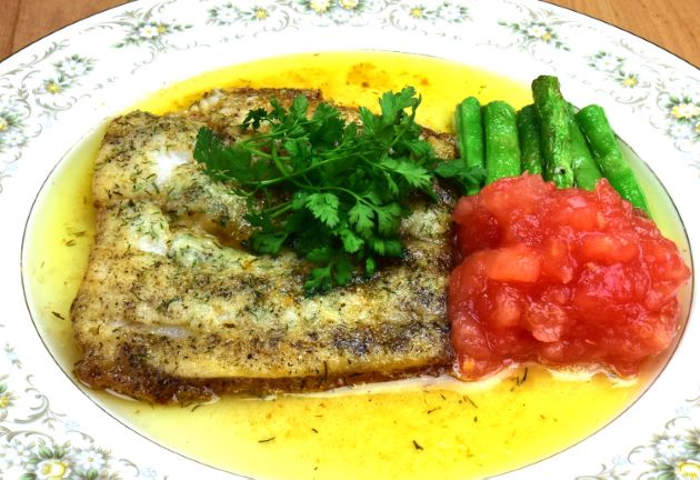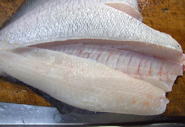 アブラガレイのムニエル フィレはそのままで料理に合わせて切る。鮮魚は五枚下ろしにして切り身にする。皮付きでも皮を引いてもいい。塩コショウして小麦粉をまぶしてじっくりソテーする。仕上げにバターで風味づけ為る。脂に油でややくどい味だが、これがおいしいと思う向きも多そう。