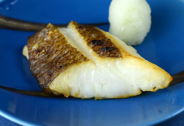 アブラガレイの塩焼き 塩焼きも定番料理のひとつである。フィレは適当に切る。鮮魚は五枚に下ろして切り身にし、振り塩をしておく。買い求めたら振り塩をして保存しておいてもいい。出て来た水分を拭き取ってじっくり焼き上げる。身に脂が混在しているのでそれが一度液化して食べるときは半液化した状態になり豊潤。冷えてもとてもうまい。
