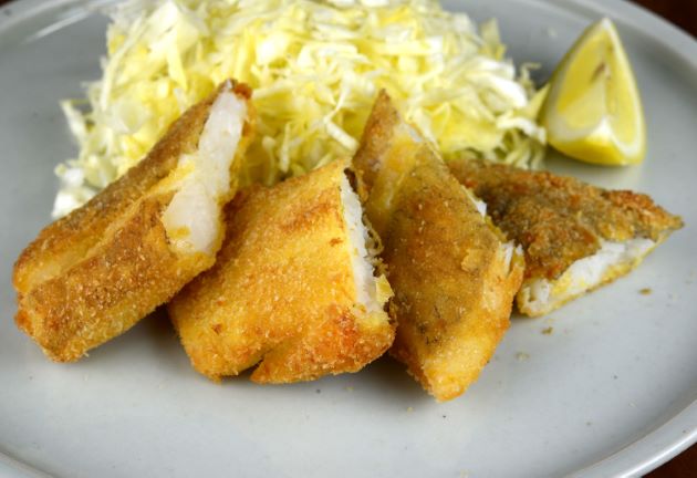 アブラガレイのフライ アメリカなどはもっぱらフライ材料にしているよう。このクセのない熱を通しても硬くならない白身はフライ向きである。水洗いして五枚に下ろす。フィレはそのまま使う。塩コショウして小麦粉をまぶし、バッター液(小麦粉・卵黄・水)か溶き卵を絡めてパン粉をつけて揚げる。揚げると筋繊維の間の脂が一度液化する。この層から染み出してくる半液化したジュがやたらにうまい。