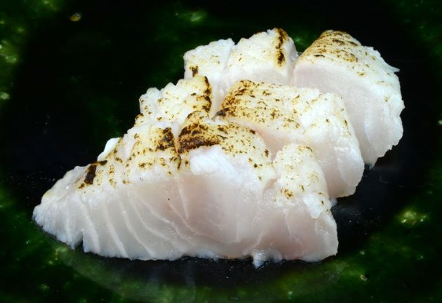 アブラガレイのあぶり ここではフィレを使った。刺身は非常においしいものの、少し単調な味である。ここではフィレの状態で表面をあぶり、氷水に落として粗熱を取る。水分をよくきり、冷蔵庫などで少し寝かせて身を落ち着かせる。これを刺身状に切る。