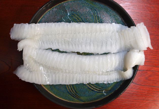 アブラガレイの刺身 鮮魚で鮮度のいいものはめったに手に入らない。ただ近年、生食できるフィレが出回っている。もともと刺身で食べて抜群においしい魚なので、フィレなどももっと活用されるべきだと思っている。ここではフィレを使ったが鮮度がいいものは五枚に下ろして皮を引き、刺身にする。