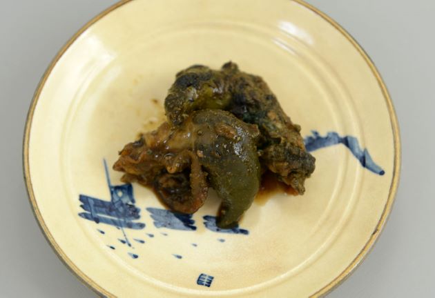 つのわたのしょうゆ煮 つのわたは生でもおいしいが、保存が利かない。たっぷり買ったときは、これをしょうゆで煎りつけるように煮ると当座は保つ。ここではしょうゆ・少量の酒を煮立たせて煎りつけた。クリックで閉じます![]()