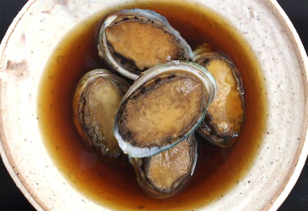 煮貝 山梨県甲府市などで作られている。古くは甲斐は山国で海産物を駿河(静岡県)に頼っていた。駿河の海産物を山越えで運ぶとき、塩漬けやしょうゆ漬け、干ものであったが、アワビはしょうゆにつけて馬の背にのせて運ばれる。この運ばれる間にしょうゆの味と馬の体温で味のよい煮貝が出来上がった。市内にある煮貝の老舗「みな与」の歴史には400年前となっているのだが、これでは年代が曖昧である。江戸期初期もしくは織豊時代ということだろうか。アワビはメガイアワビ、クロアワビ、マダカアワビが原材料である。写真の原料はハワイで養殖されたもの。醤油でじっくり煮込んでいる。クリックで閉じますエゾアワビの煮貝