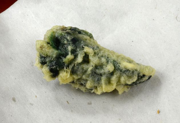 エゾアワビの天ぷら むき身にして塩もみする。水分をよくきり、小麦粉をまぶし、衣をつけて高温で短時間揚げる。中心部分は完全に生でいい。表面を揚げることで味が濃厚になり、生と熱を通したのと両方の味わいがひとつになった、といった感じになる。揚げたてを食べると、止まらなくなる。クリックで閉じます![]()
