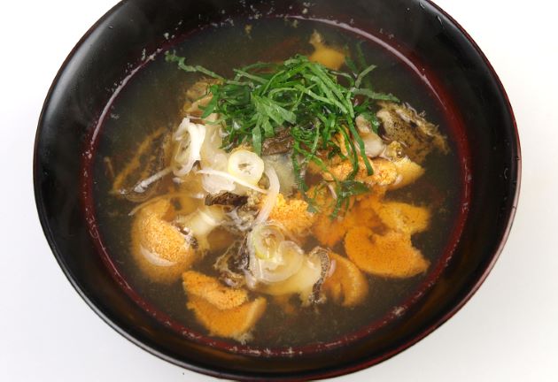 エゾアワビの水貝 水貝は塩加減した昆布だしを冷やして、そこに適当に切った筋肉とつのわたを浮かせて食べるもの。昆布とアワビが一緒になるとこれほどに味わい深いのか、と驚くはず。しょうゆで食べる以上にアワビ本来の味が生きる。クリックで閉じます![]()