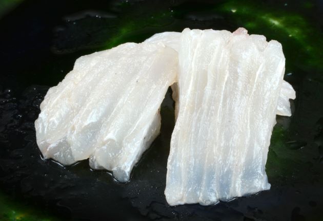 ツバメウオの鰭筋の刺身 背鰭・尻鰭を支える筋肉は太く長い。鰭筋のみ切り取って、別に皮を引くといい。体幹部の筋肉よりも脂が豊かで、食感が強い。噛みしめるとじわりと脂がでてきて溶けて甘いと感じる。
