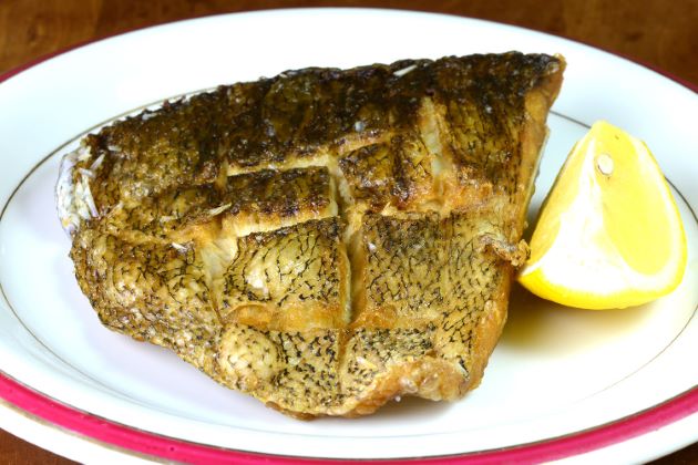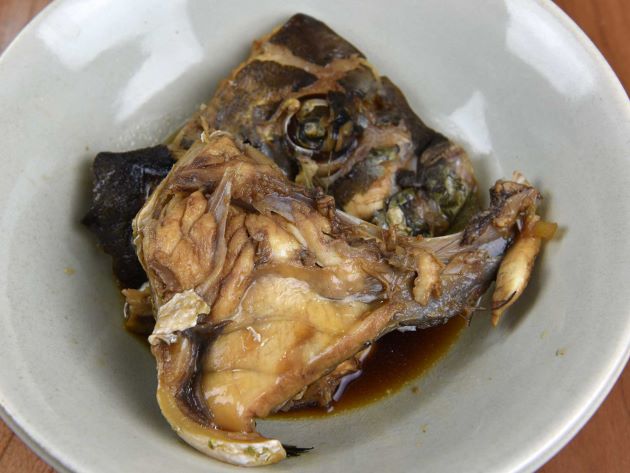 ツバメウオの煮つけ ここでは頭部(兜)を煮つけた。白身で身が締まっていて、磯臭みのないものは煮つけにしてもご馳走だと思う。頭部は半割にして湯通しし、冷水に落としてヌメリなどを流す。水分をよくきり、水・酒・しょうゆで煮る。砂糖で甘味を加えてもいい。