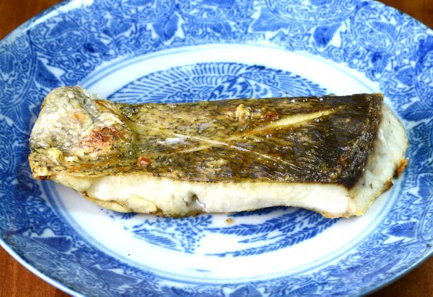 ツバメウオの塩焼き 水洗いして三枚に下ろし、適当に切り、振り塩をする。1時間程度寝かせてじっくり焼き上げる。皮の香りよく身はしっとりとして味がある。