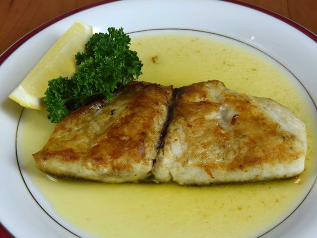 ツバメウオのバター焼き 本種のような熱帯域に多い白身魚にもっとも相性のいい料理法である。切り身にして塩コショウする。これを多めの油でじっくりとソテーする。仕上げにマーガリン(バター)で風味づけする。