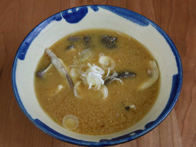 ツバメウオのみそ汁 あらを集めて置く。湯通しして冷水に落として残った鱗やヌメリを流す。水分をよくきり、水から煮出してみそをとく。ここでは沖縄県宮古島のみそを使った。フーチバー(ヨモギ)などがあればとても合う。