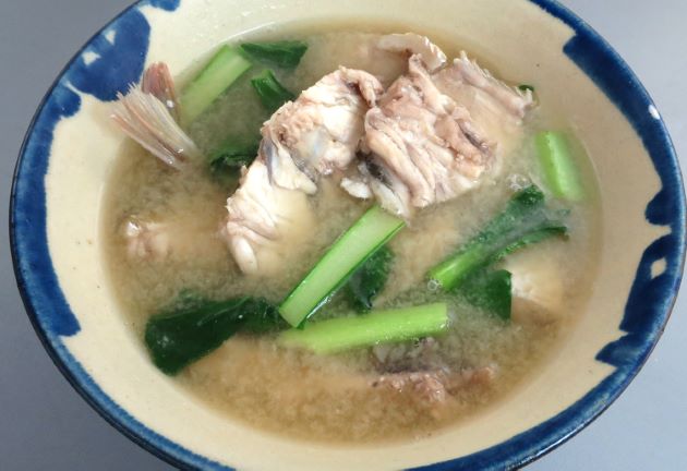 キツネフエフキの魚汁(みそ汁) 刺身などにして出たあら、中骨などで作る。食べやすい大きさに切り、湯通しして冷水に落とし、残った鱗やぬめりを流す。水分をよくきり水から煮出してみそをとく。非常にうま味豊かな汁で、付着している身もとてもおいしい。クリックで閉じます![]()