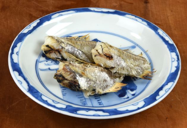 マルヒウチダイの塩焼き 小型は鱗を取り頭を襷に落とす。内臓を取り去り、水分をよくきり振り塩をする。1時間くらい寝かせて焼き上げる。水分がやや多い魚だが、焼くことで適度に締まる。皮の風味が際立ち、身離れがよくおいしい。