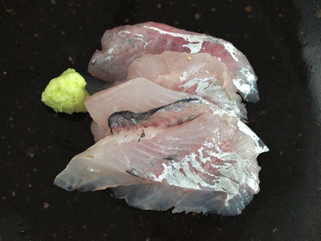 マルヒウチダイの刺身 水洗いして小型は頭を襷に落とす。三枚に下ろして腹骨・血合い骨を取り、皮を引き刺身状に切る。やや水っぽく軟らかいが、小さな固体でも脂がのって甘く、味に奥行きが感じられる。イヤミのない味で万人向きの味だ。